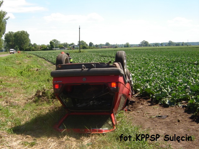 Po przyjeździe na miejsce zdarzenia zastano samochód VW Golf znajdujący się na dachu, poza drogą. Poza autem znajdował się kierowca, któremu została udzielona pierwsza pomoc. Strażacy odłączyli akumulator w pojeździe i sprawdzili czy nie doszło do wycieku płynów eksploatacyjnych. W akcji wziął udział 1 zastęp OSP Słońsk i 1 PSP Sulęcin.