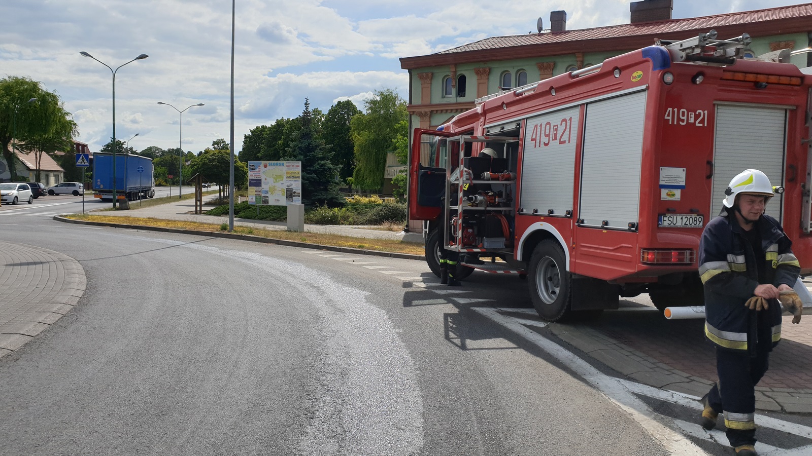 do usunięcia plamy oleju napędowego na rondzie w Słońsku. W działaniach udział wziął 1 zastęp OSP Słońsk.